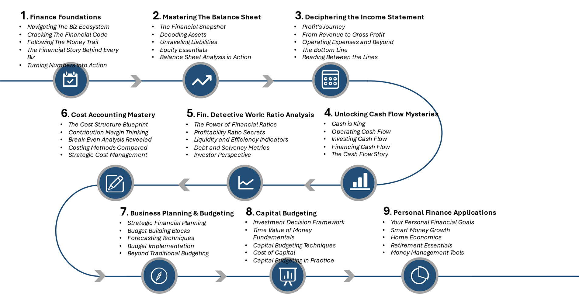 This course will be delivered online over 6 sessions of 3 hours each, scheduled twice weekly. The structured progression allows participants to build their financial knowledge incrementally while providing sufficient time between sessions to apply concepts in their professional environments.
