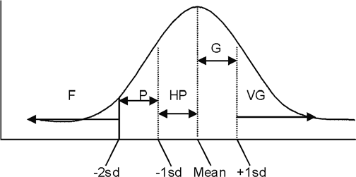 P = Pass (Mean - 2sd < P < Mean - 1sd)