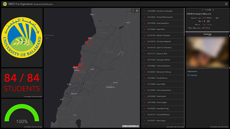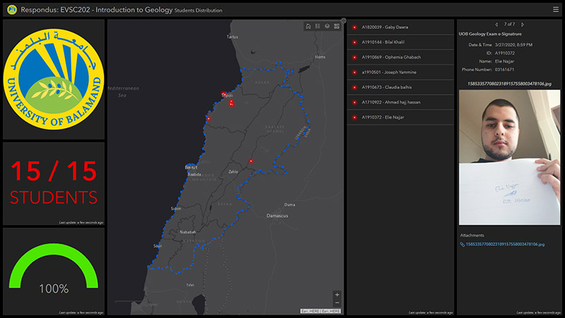 The GIS Center at the Faculty of Engineering also designed an innovative approach to live track the geographic location of students sitting for the exam with ID authentication. This innovative system ensures that students are not in near proximity while taking the exam with their geographical location tracked live. The integration of location intelligence and an online proctoring solution is considered a pioneering approach, unique to the University of Balamand, which will ensure the highest level of integrity in non-proctored exams. This effort falls within the framework of directives of the University President, Dr. Elias Warrak, who heads the UOB COVID-19 Crisis Management Team that the university has formed to tackle different aspects of the Corona crisis and its repercussions on the university, society and the country.
