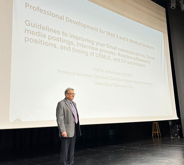 The University of Balamand (UOB) hosted an informative seminar on January 29, 2024, aimed at guiding Year 3 and Year 4 medical students towards successful career pathways. The seminar featured esteemed speaker, Dr. Fadi Abdul Karim, where he delved into critical aspects of the Research/Residency Application Journey, covering Email Communication, Interview Preparation, Timing Importance of USMLEs, Networking, and CV Organization. Dr. Abdul-Karim's insights aimed to empower students in accurately presenting their achievements, maximizing positive responses, and ultimately securing their desired positions.